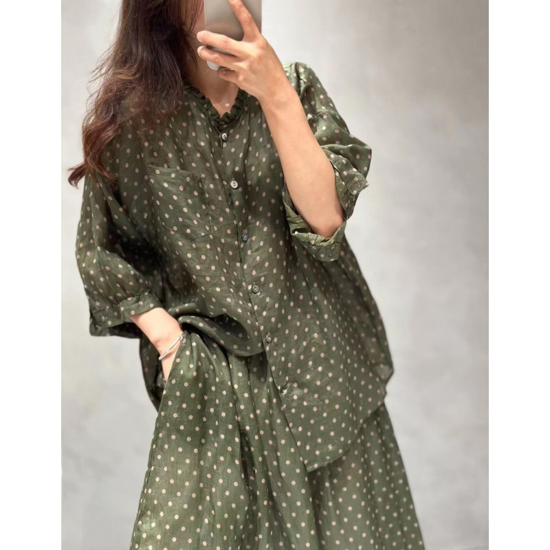 Cz9753ラミー麻の丸い点の純色の半袖のシャツの女性の2024夏の新型のゆったりしているシャツのカジュアルな薄い上着