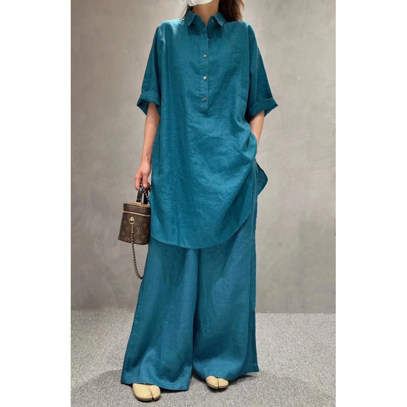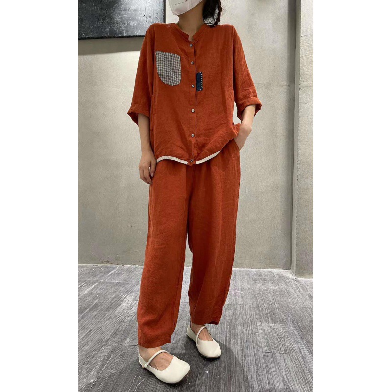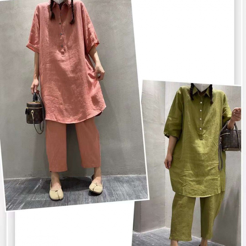 Cz9388 9168亜麻純色スーツシャツカジュアルパンツ2024夏文芸シンプル2枚セット