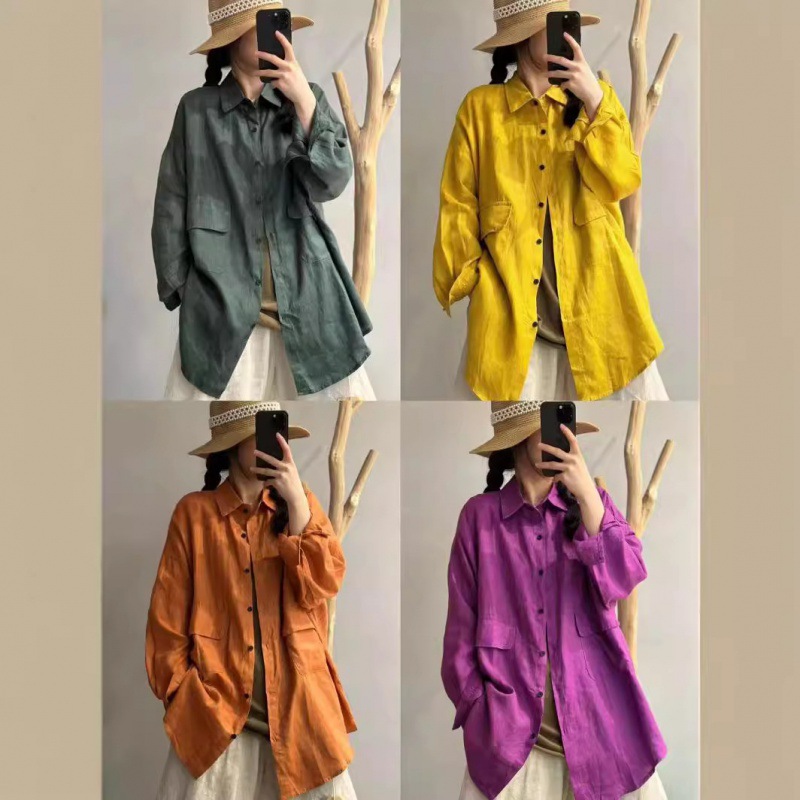Cz9509亜麻のゆったりした大きい版のファッションの百合のカーディガンのシャツの2024の新型の文芸のカジュアルな上着の女性