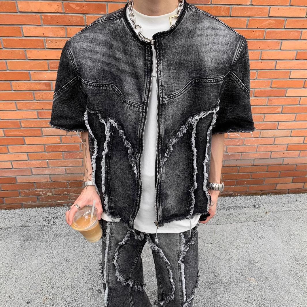 タイダイウォッシュ加工のダメージ加工ショートデニムスーツ、ローエッジステッチ、マイクロフレアジーンズジャケット、ローエッジトレンド2025、ハンサム