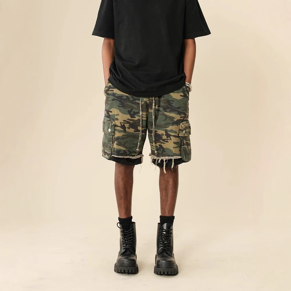 2025 ハイストリートウォッシュドローエッジダメージ加工ダブルレイヤーレトロワークウェアポケットトレンディブランド迷彩ショートパンツ夏の5点パンツメンズトレンディ