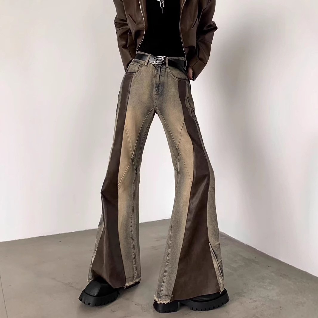 ダメージ加工メイラードブラウンアメリカンレトロジーンズメンズニッチステッチデザインマイクロフレアパンツ2025トレンド