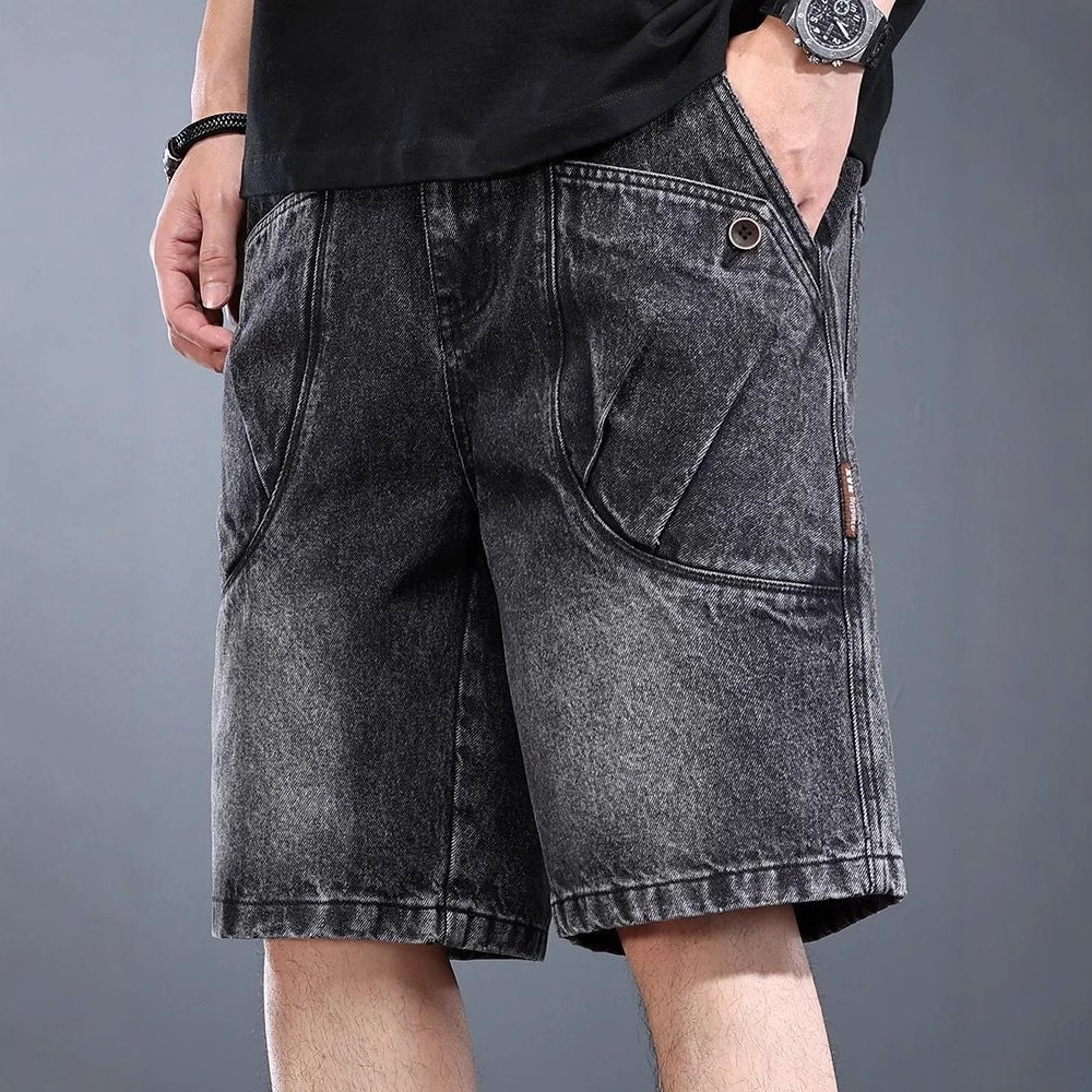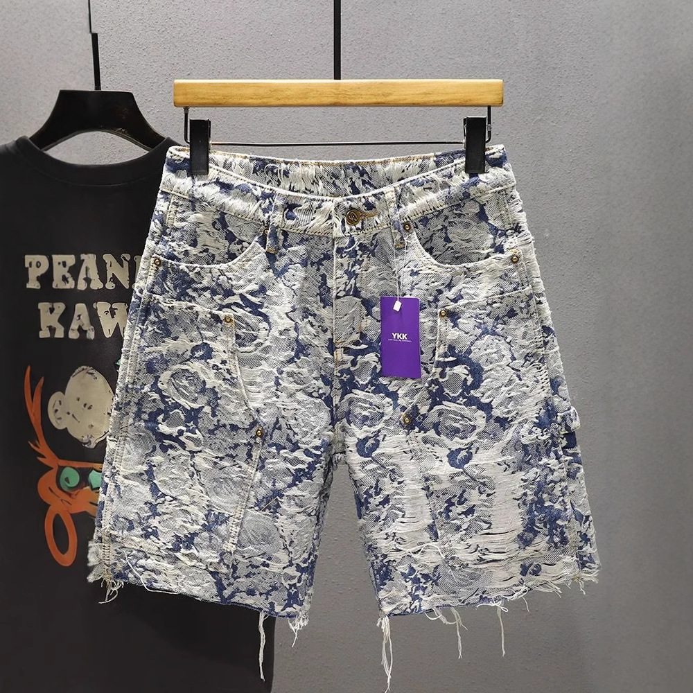 夏用の高級ヘビーウェイトデニムショートパンツ、ウォッシュ加工、ダメージ加工、アメリカンレトロな5点パンツ、ゆったりとしたトレンディなワークウェアミッドパンツ
