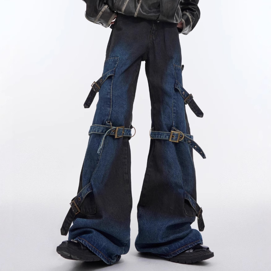 アメリカンレトロなマルチポケットオーバーオールメンズバイブデザインルーズストレートジーンズワイドレッグフロアレングスパンツトレンディ
