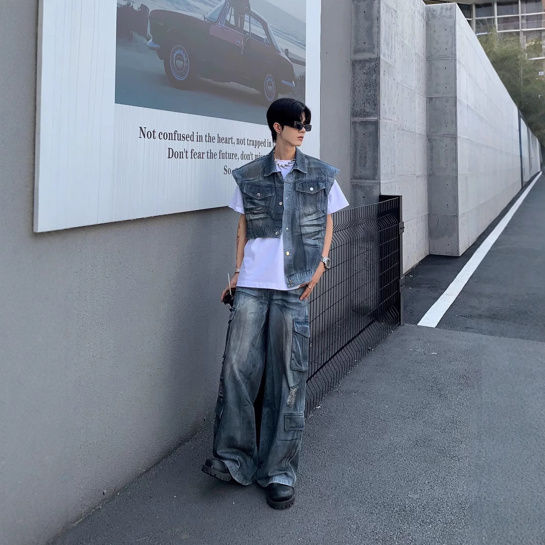 2025 夏と秋のグラデーションカラーウォッシュデザインレトロダメージデニムベストジャケットプリーツラフテクスチャーノースリーブジャケット