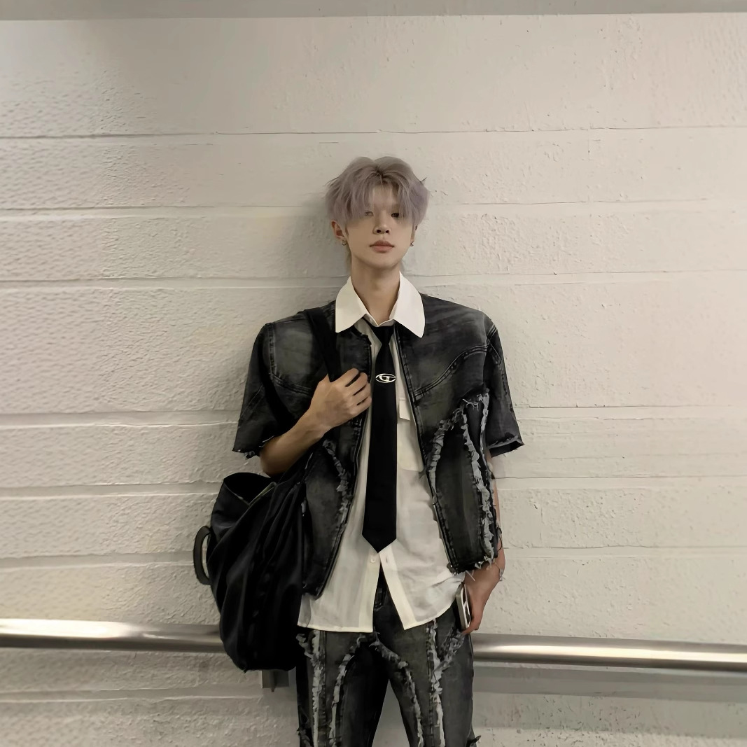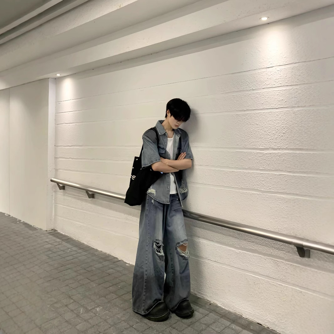 2025/ss韓国ニッチダメージデニムスーツリッピングデコンストラクトショルダーパッドシャツスーツリッピングパンツ半袖トレンディ
