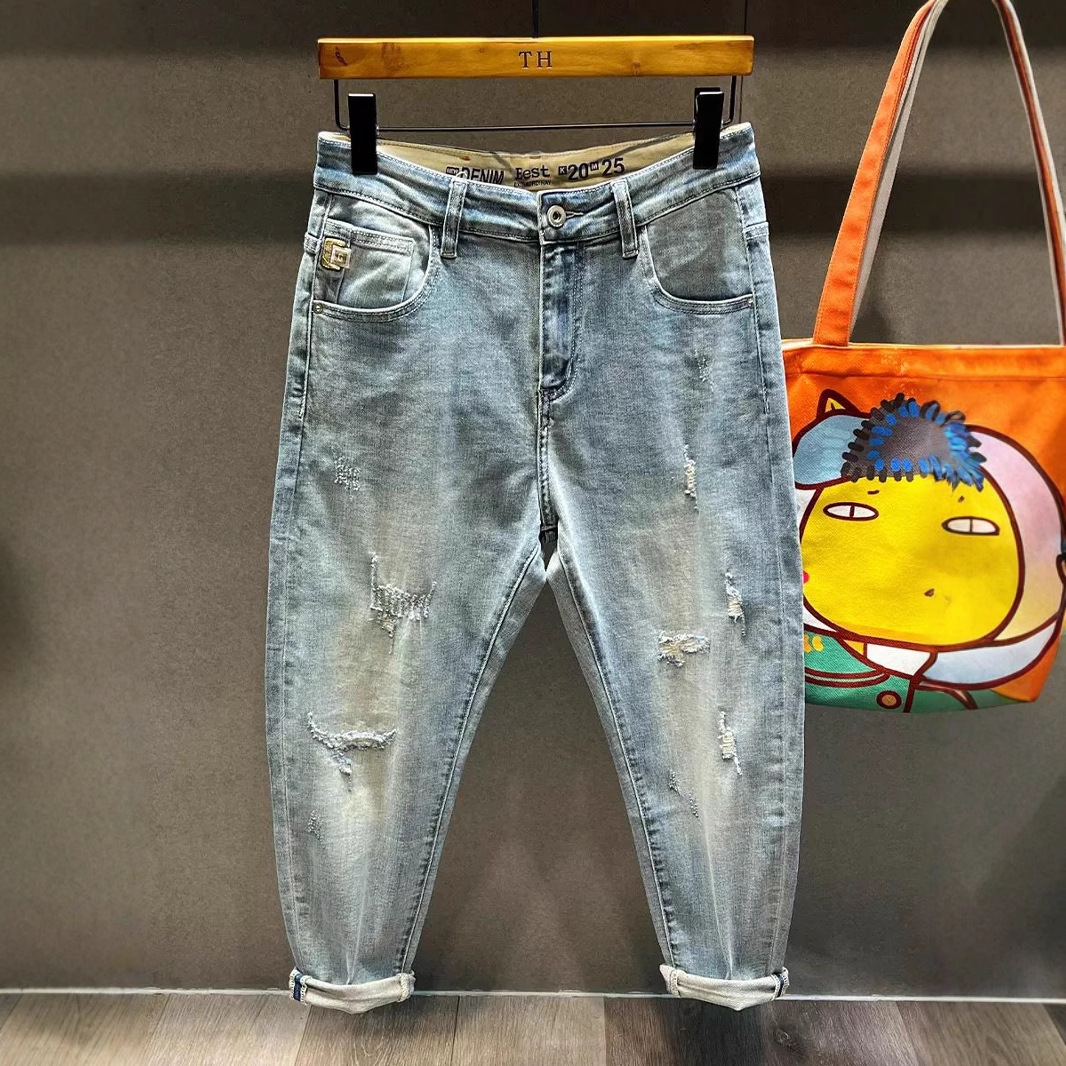リップドパッチレトロ9点ジーンズメンズトレンディブランドスリムフィット春と秋のハンサムプリントカジュアル9パンツ