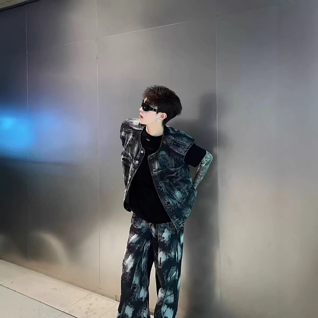 2025 夏インク染めデニムニッチスーツデザイン肩パッドベストジャケットルーズストレートジーンズ 2
