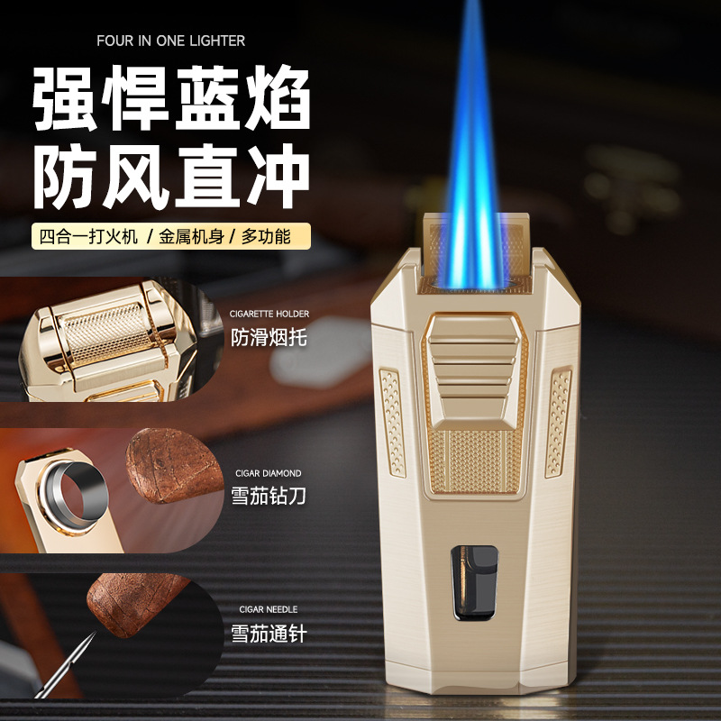 新しいシガーライター 3 ストレートブルーフレーム防風ライターポータブルフォーインワン多機能シガーライタースプレーガン
