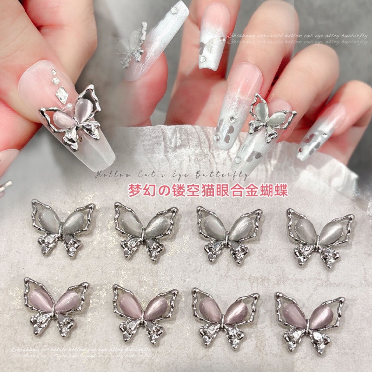 銀色の猫の目の蝶のネイルアクセサリーの新型の立体の透かし彫りの合金のダイヤモンドのネットの赤い爆発金は爪の大きいドリルを身につけます。