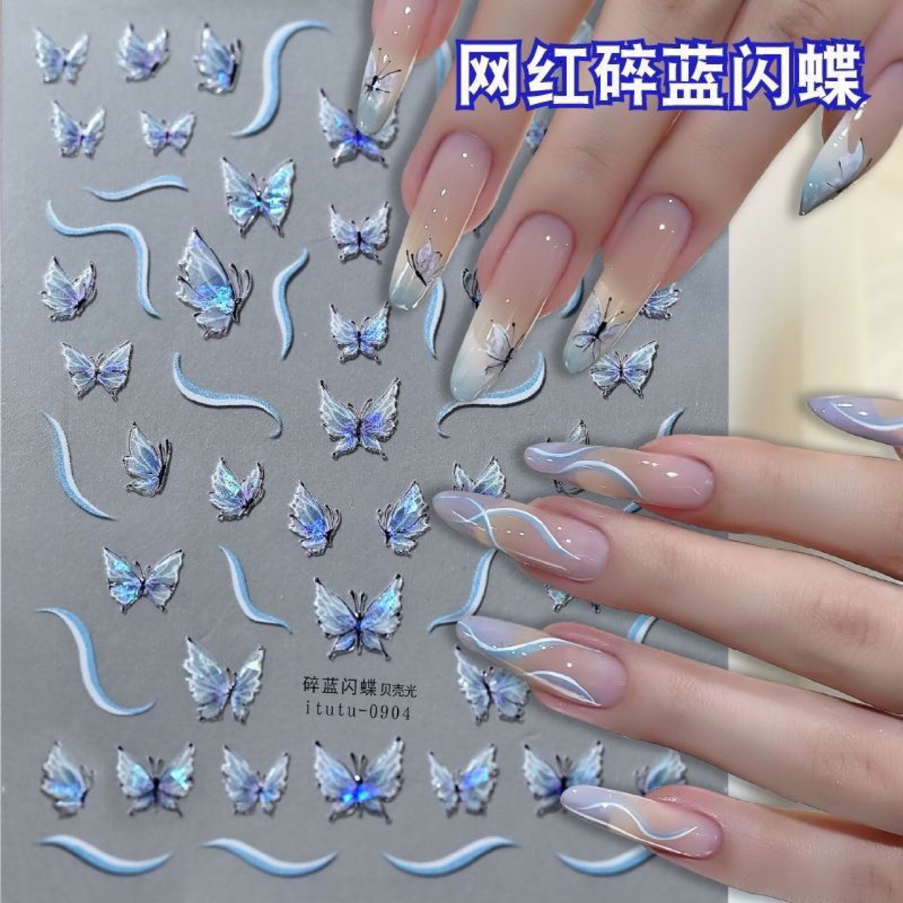 インターネットセレブ人気のフラッシュバタフライネイルアートエンボスステッカーシェルライトアイスブルーバタフライアイスクリスタルブルーバタフライネイルデコレーション