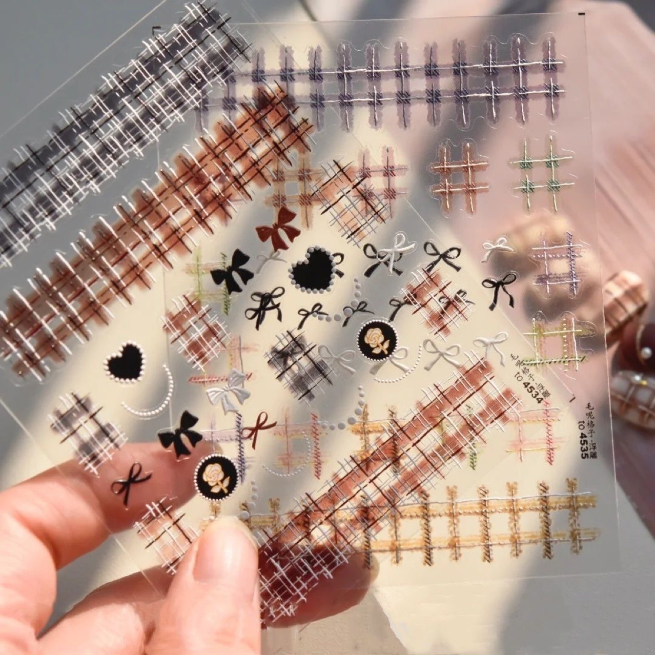 新品秋冬毛はね格子ネイルシール蝶結びエンボス香風パール高級ローズ爪バックゴム