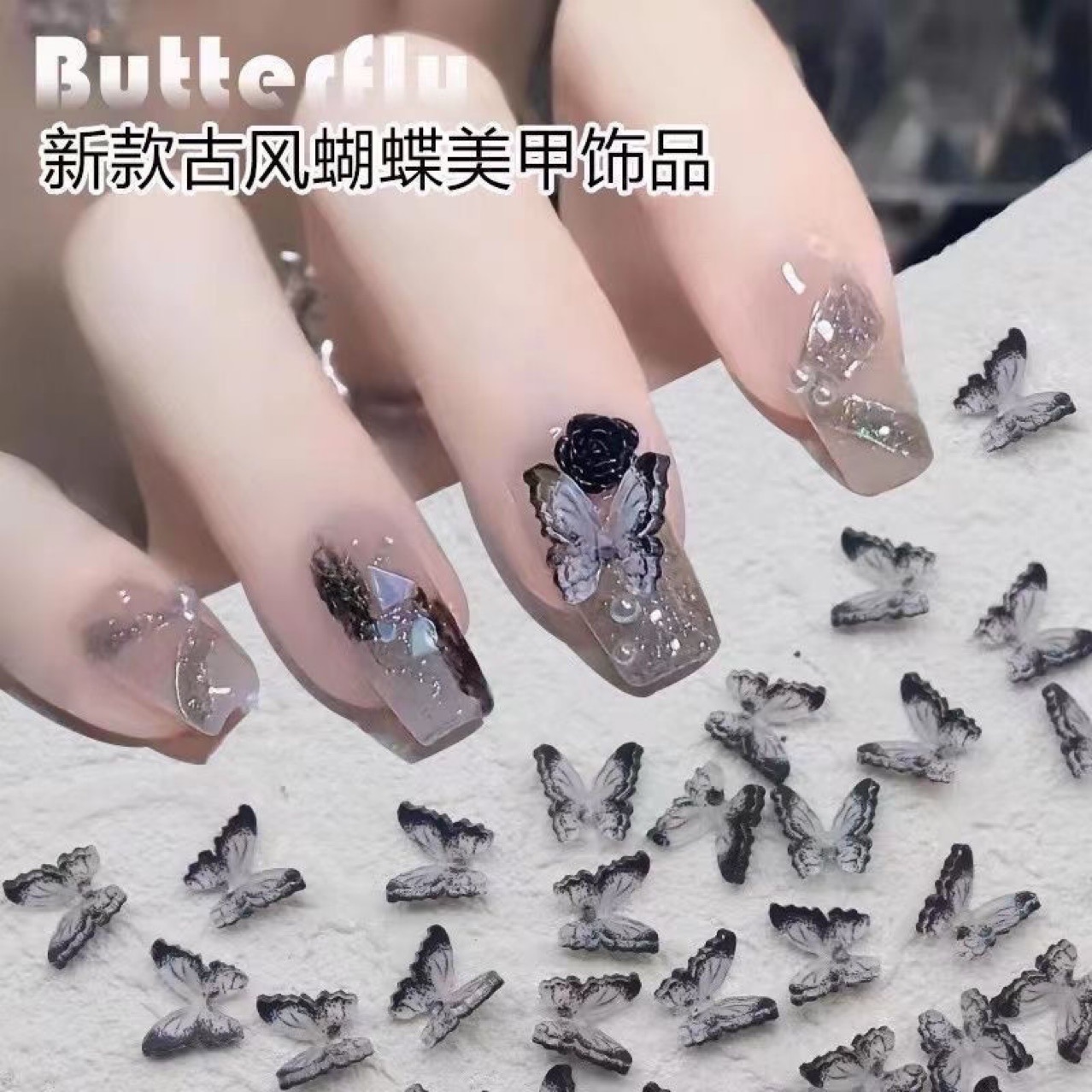 新しいネイル古風蝶白黒グラデーション暗黒系立体透色装飾宮廷風樹脂アクセサリードリル