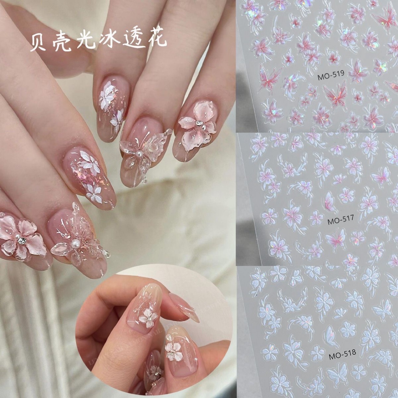 新作氷花レリーフネイルステッカー立体仙気貝殻光五弁花半透ピンク水彩花蝶