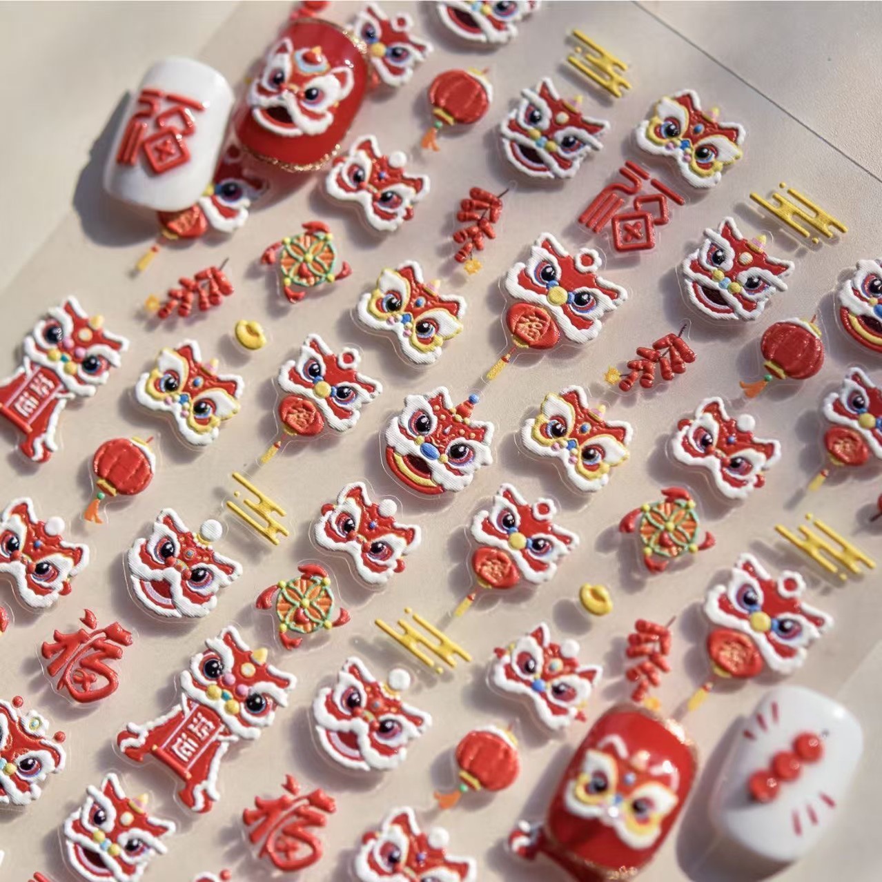 中国風2025年新年鴻運覚醒ライオン蛇年ネイルシール立体レリーフ新年覚醒ライオン赤旧正月
