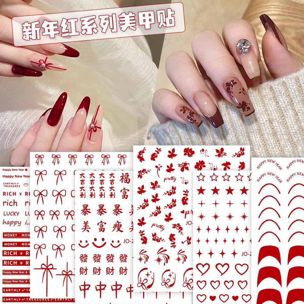 新年の赤いネイルシールのお祝いの花の蝶結びの愛のフランスのアルファベットの暴富新国風のバックゴムの爪の貼り付け
