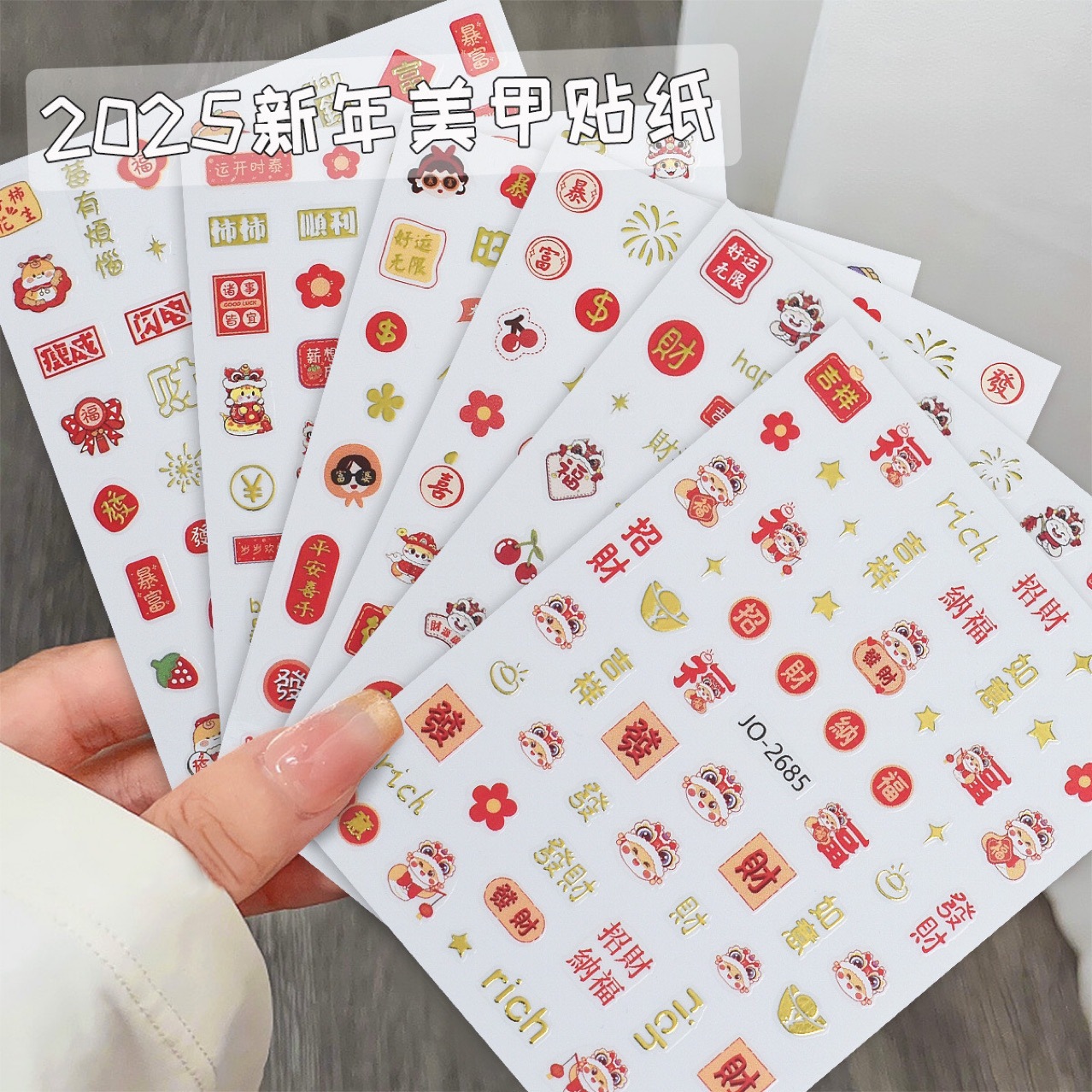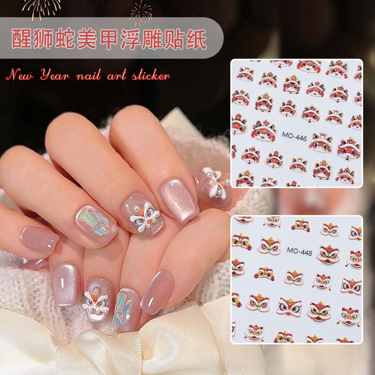 2025年新年のレリーフネイルシール5D立体花火が金持ちになった爪に年越しのライオンシールを貼る