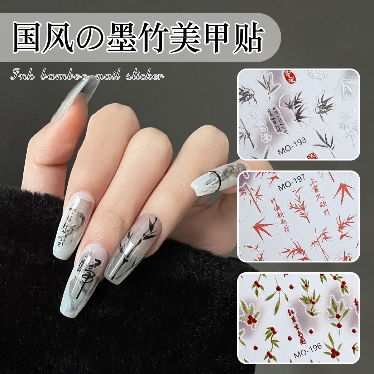 新中国風国風水墨ネイルシール2024新国潮赤豆竹墨竹背ゴム爪装飾品