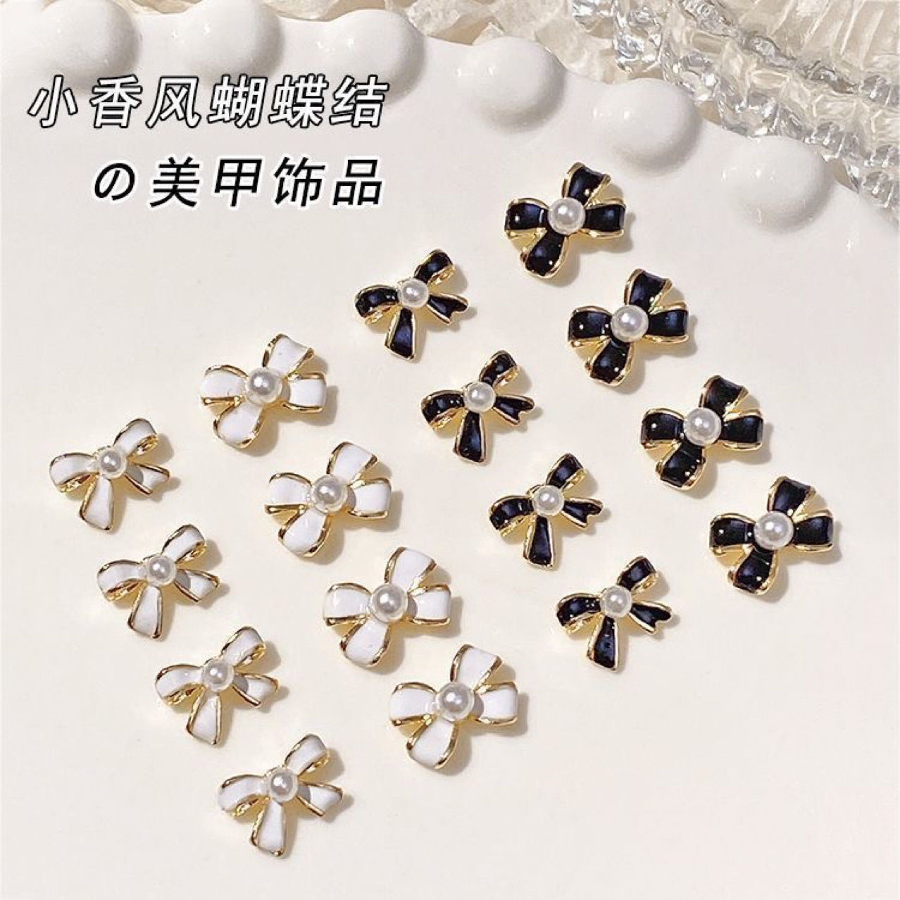 新しいインターネットセレブの小さな香りのネイルアート合金ジュエリーオイルドリップパールリボン黒と白のシンプルなフレンチネイルデコレーション