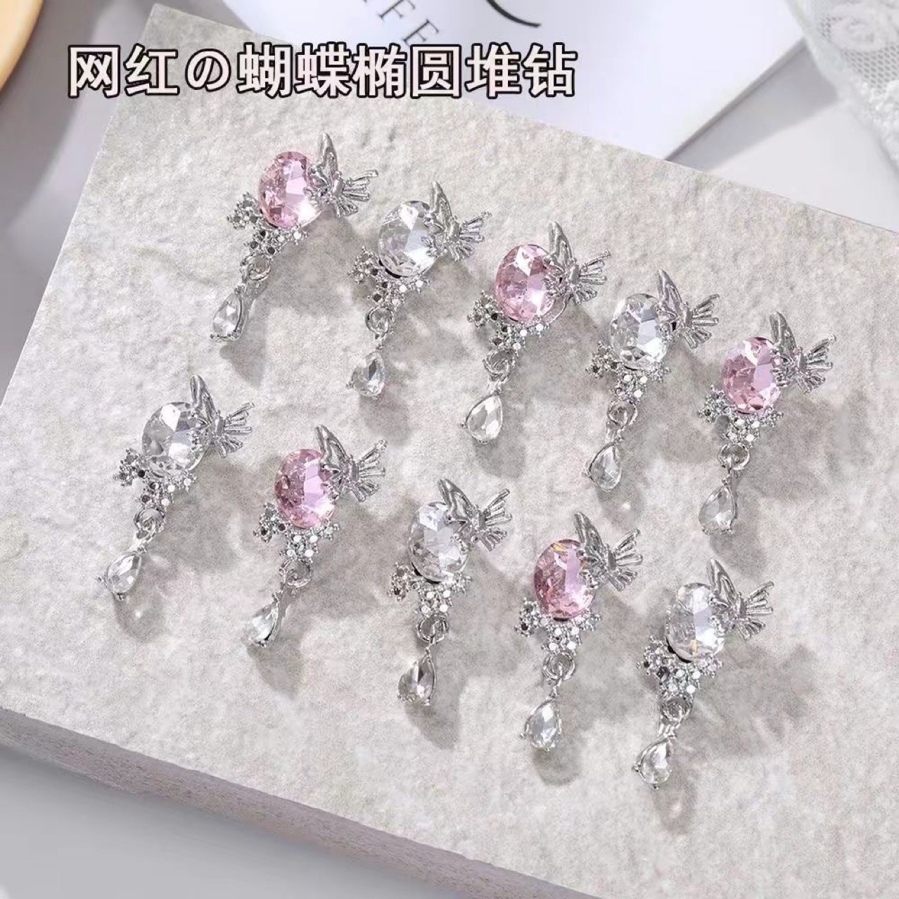 新商品のネット紅の透かし彫りの蝶の山のドリルの合金のネイルアクセサリーのペンダントのチェーンの楕円の山のドリルの蝶の爪の装飾