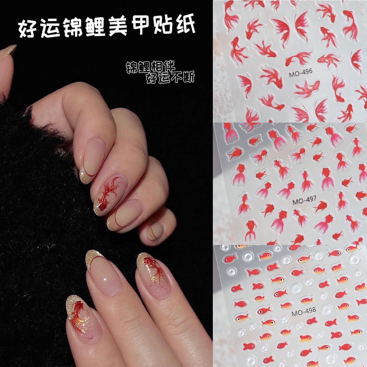 赤い本の熱いタイプの錦鯉のネイルの幸運の小さい金魚の赤い新年の甲の春のネイルの水彩の手描きの蝶の薄いです。