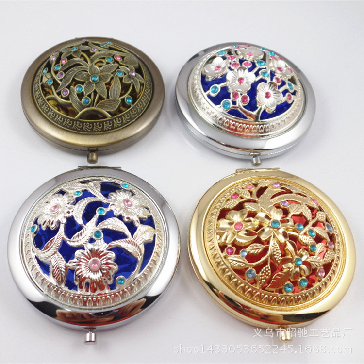 広告の贈り物のメーカーの復古銅の透かし彫りの両面は携帯の金属の化粧の鏡の小さい鏡を折り畳みます。