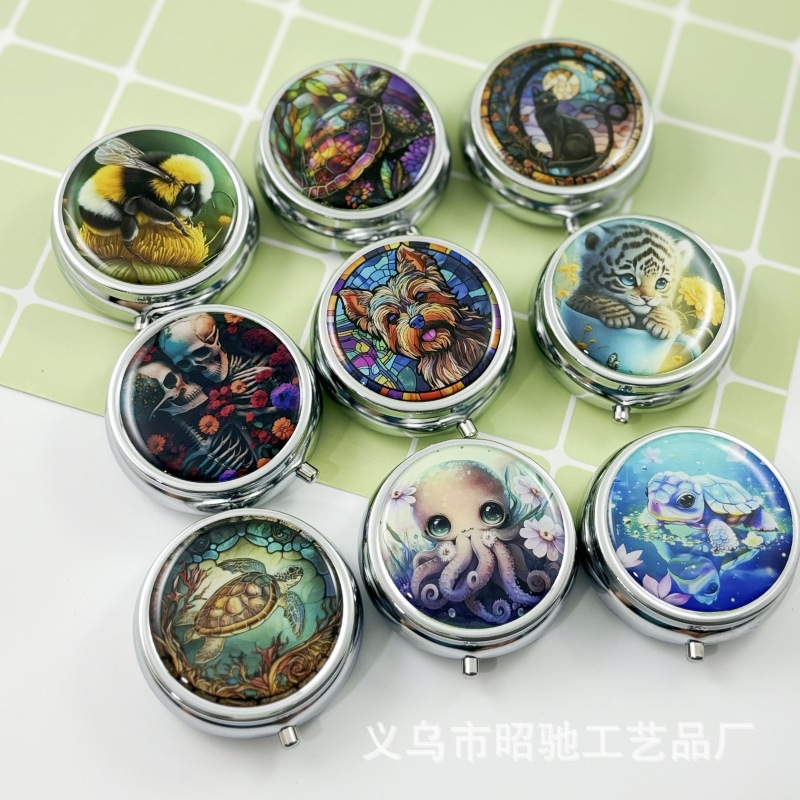 欧米のゴムの金属の薬の箱の携帯の円形の3格の錠剤の箱の動物の生命の木のゴムの口の脂の箱