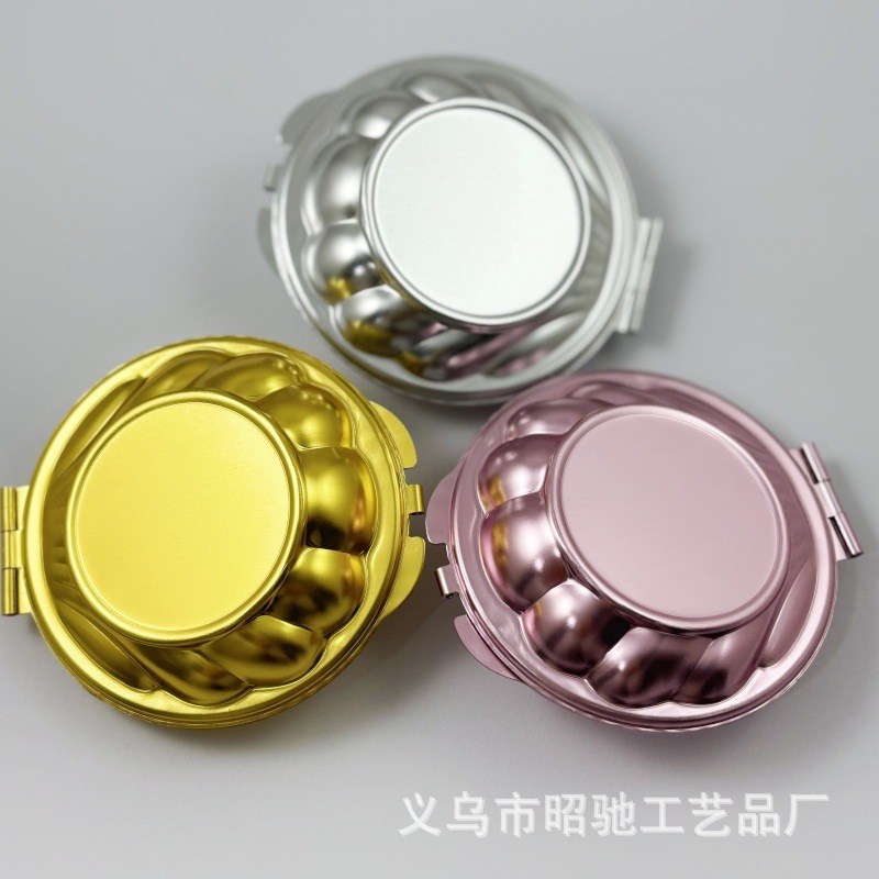 バラ色の金色の銀色の丸い貝殻は鏡を折り畳みます。