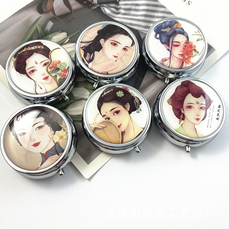 香膏分注箱円形金属薬箱三格錠剤箱古風美人滴香膏箱