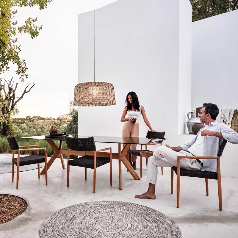 屋外中庭テーブルと椅子B&Bテラスホテルヴィラオープンエアガーデン無垢材チーク籐織りダイニングテーブルと椅子の組み合わせ