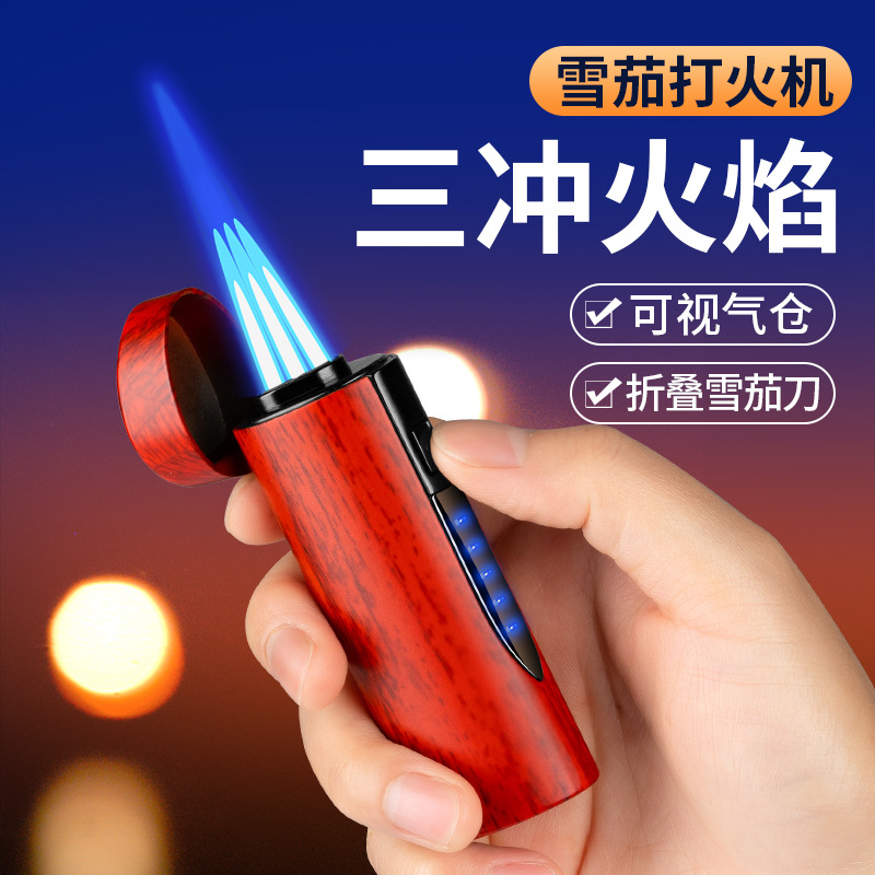 創意シガー大火力三直沖防風ライター青炎シガーナイフ付き可視ガス容量クロスボーダー