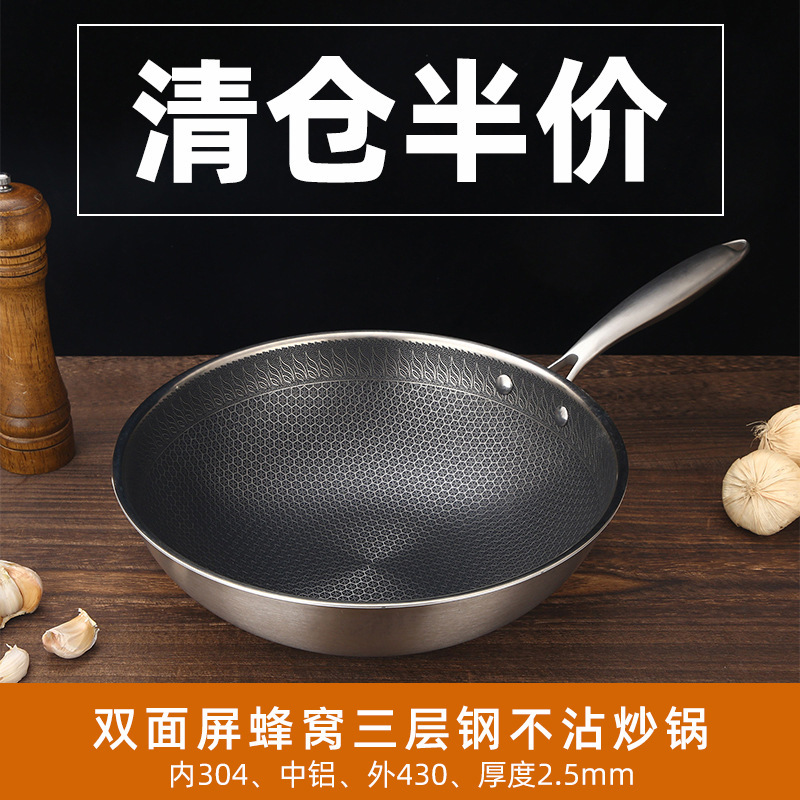 クリアランス特別価格ハニカム三層スチールノンスティックポットステンレス鋼中華鍋家庭用低油煙中華鍋ユニバーサル中華鍋