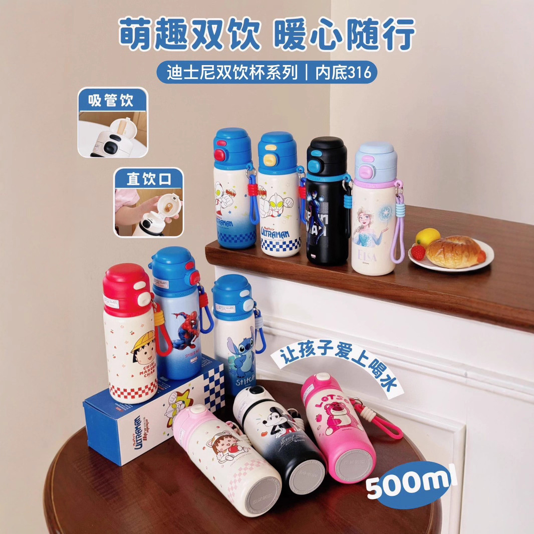 子供の漫画魔法瓶カップダブルドリンクストローカップかわいい小学生ケトル魔法瓶カップ