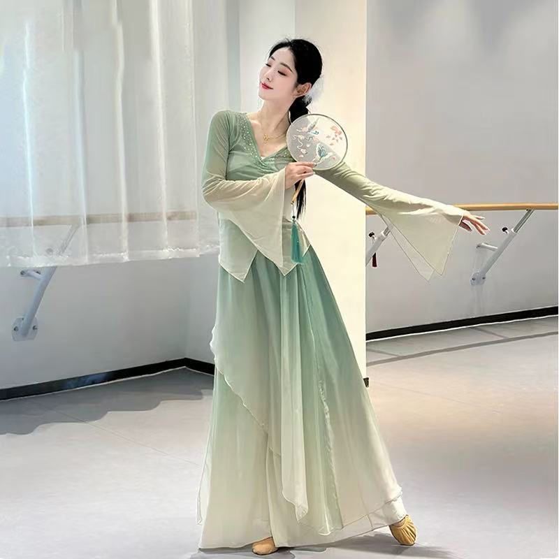 女性用クラシックダンス衣装、エレガントなガーゼ、妖精のような中国舞踊練習服、グラデーションダンスパフォーマンス衣装