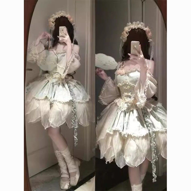 緑の竹の葉プリント新しい中国風バレエスタイルエレガントな妖精ロリータスカートロリータプリンセススカート乳白色