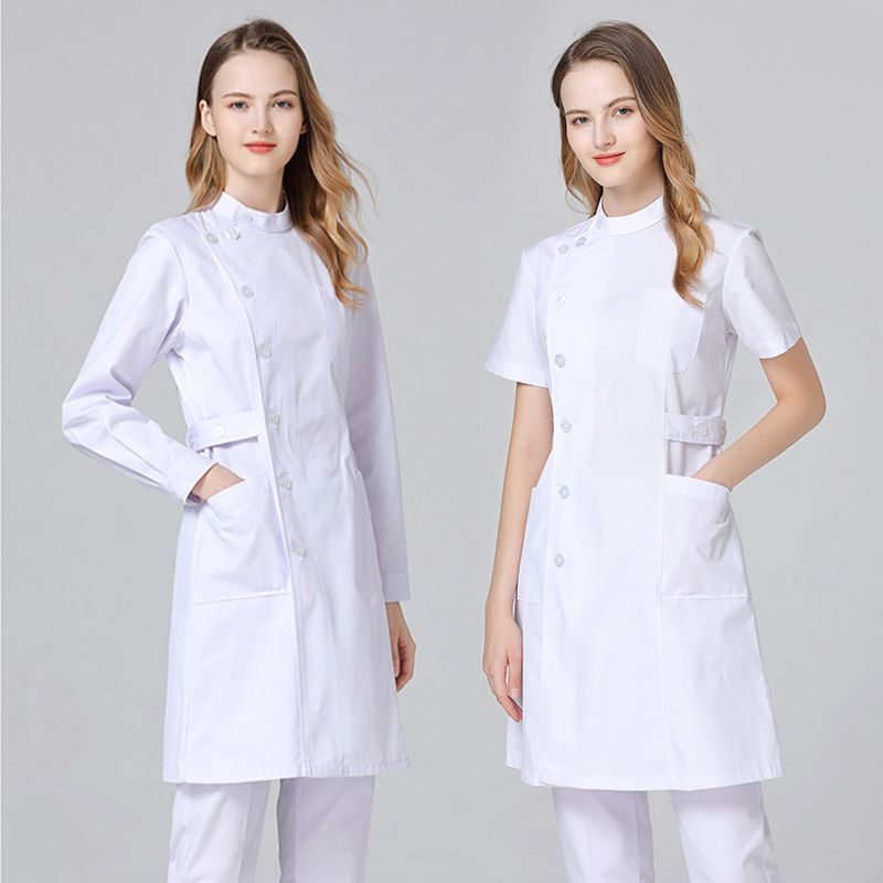ナース服女性長袖白衣美容室薬局作業服スプリットスーツ夏半袖スタンドカラーラボ