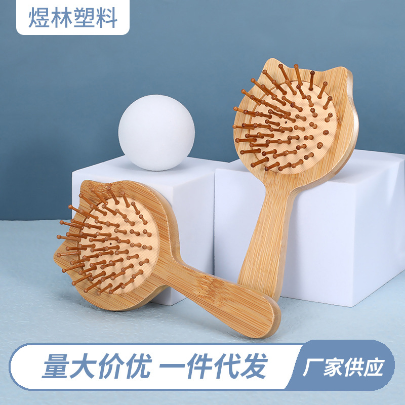 かわいい漫画の猫の形の美容室の楠竹の櫛は家庭用マッサージの頭皮のエアクッションを持ってマッサージします。