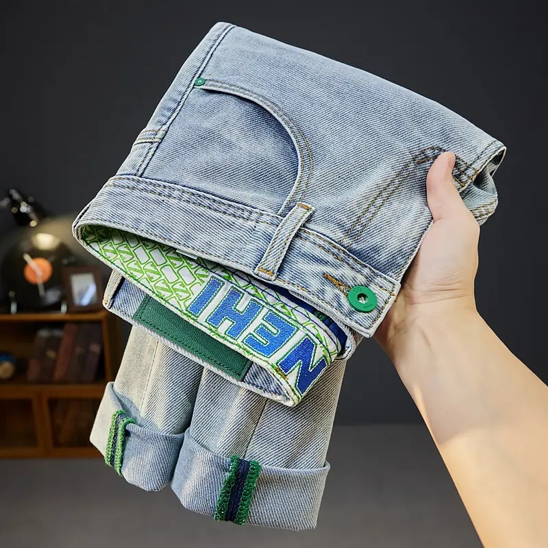 夏のトレンド英国ストレートストレッチコットンメンズデニムパンツ若々しいコントラストカラー手拭きクラフトミッドウエストデザイン