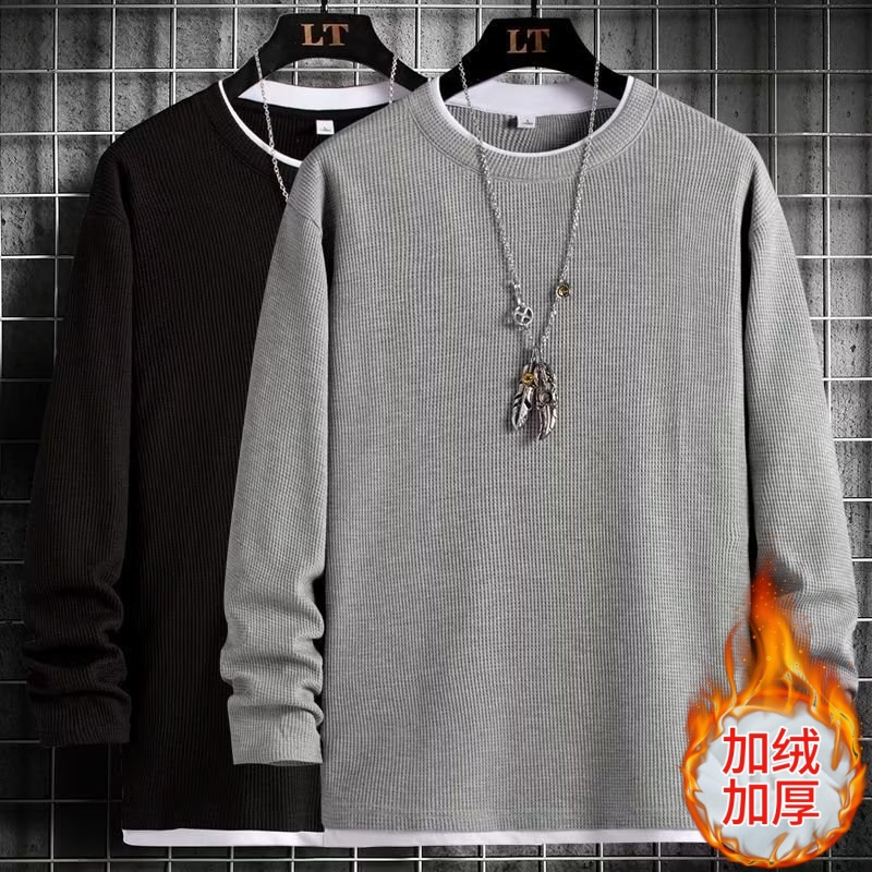 ワッフルtシャツ男性長袖insファッション春秋冬の偽の2つのファッションの格好いい丸首の底のシャツを合わせます。