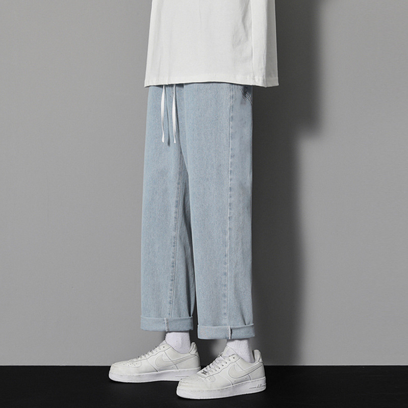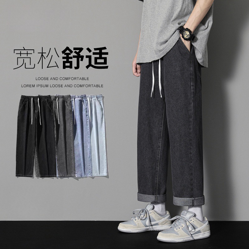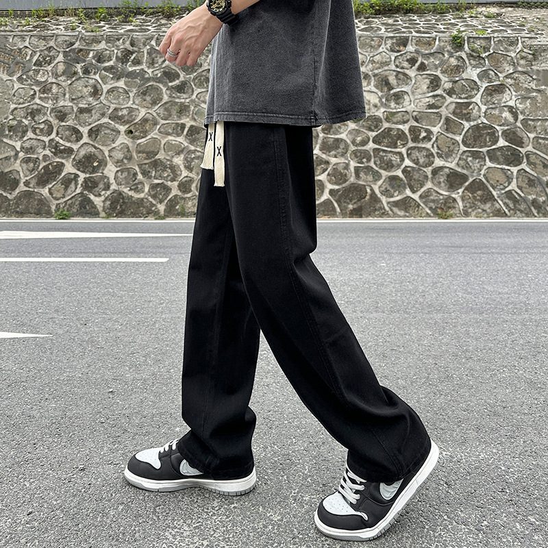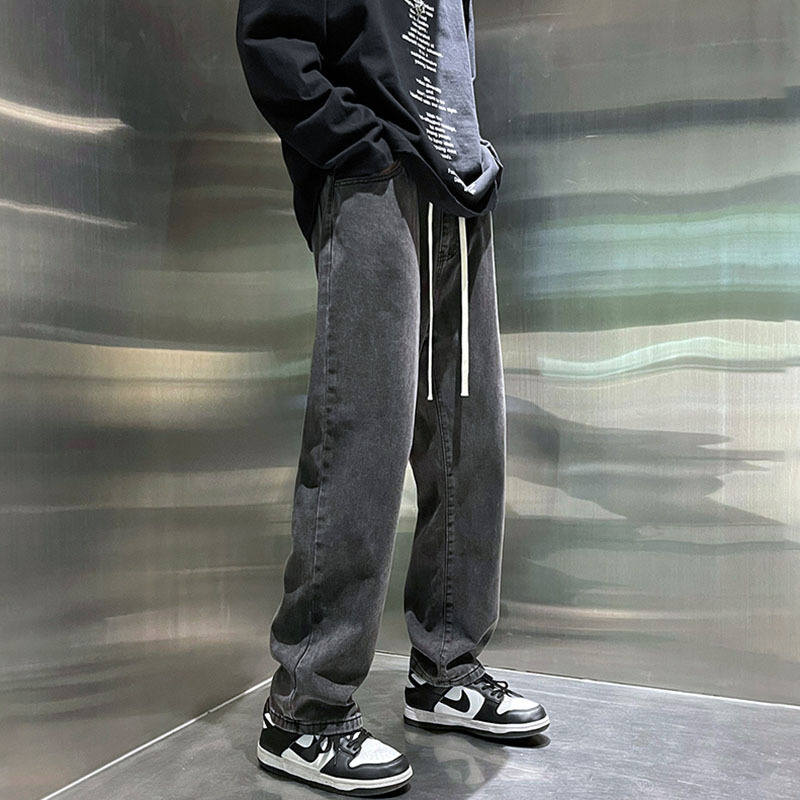 ジーンズ男春秋ゆるいワイドパンツカジュアル長ズボン高街格好いい男のストレート引きひもが腰を緩めている