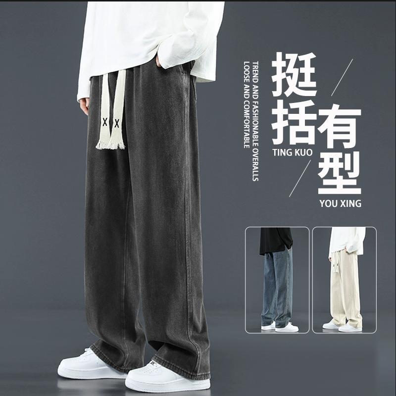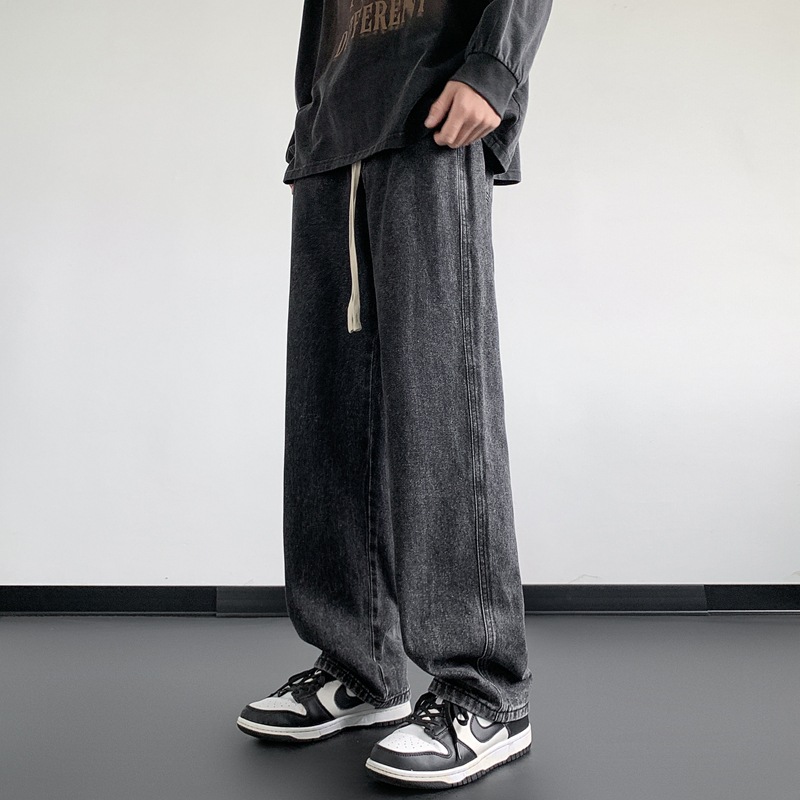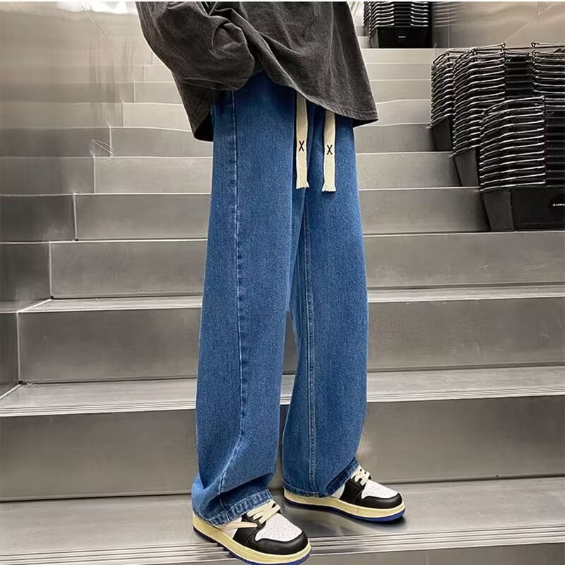 男性のジーパンの春と秋の韓国版のファッションの広い足の男子学生は縄を引いて幅を緩めてベルトのカジュアルなズボンのまっすぐな筒を緩めます。