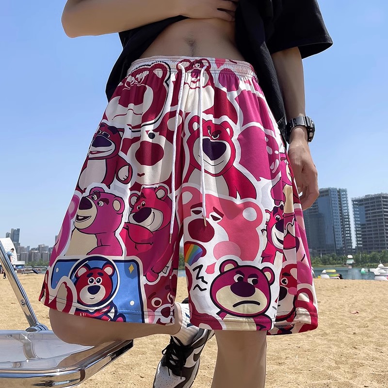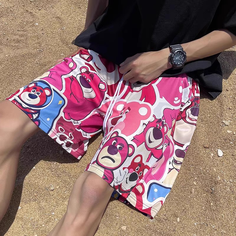 海辺のビーチパンツ男女夏のゆったりとしたカジュアルな家で寝ているズボンカップルのいちご熊プリントのズボンの頭は大星を派遣します。