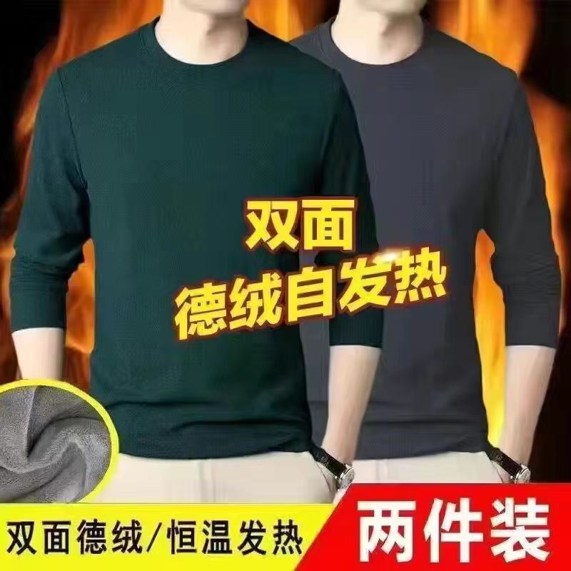 デコルテの中に丸襟の長袖のtシャツを掛けて、男性服を着ます。