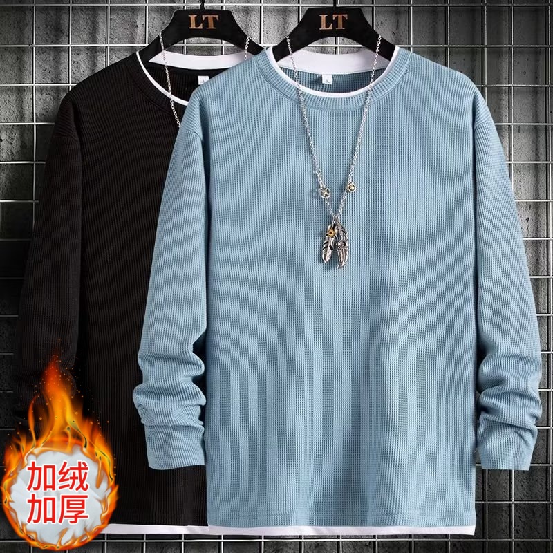 偽の2つの長袖のtシャツの男性の春秋の冬の韓国版の潮流のゆったりしている大きいサイズのベルベットの重いポンドのワッフルの上着