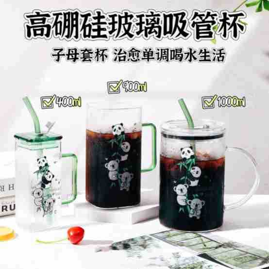 パンダグラス高ホウ素シリコン耐熱カップオフィスカップ家庭用大容量ストローカップ小プレゼント卸売り