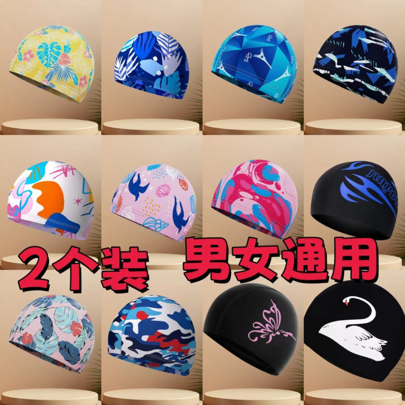 女性用プリントスイミングキャップ2個パック、大人用ロングヘア、大きな頭囲の布製スイミングキャップ、男性用高弾性学生用