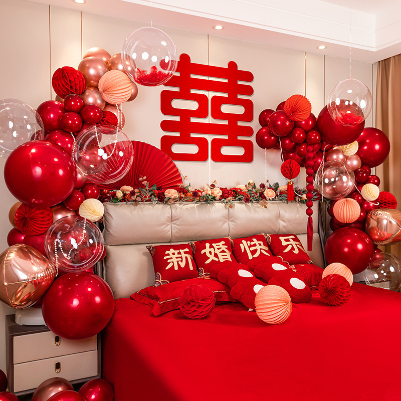 結婚式の部屋のレイアウトセット男性と女性の新しい家のマスターベッドルームのベッドサイドの背景の壁の装飾バルーンウェディング用品