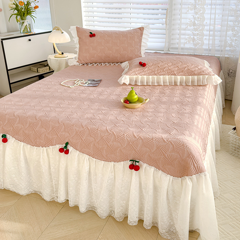 夏プリンセス風レースベッドスカートマット3点セット洗濯機で洗える涼しいアイスシルクマット折りたたみエアコンソフトマット