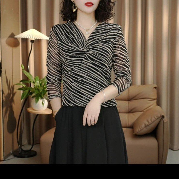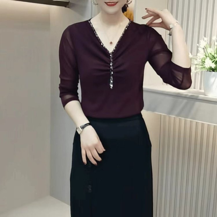 簡単な百合2024秋のタイプの7分袖は腰の洋気を収めて年齢を減らしてやせているvネックの婦人服の純色のシャツの上着を現します。
