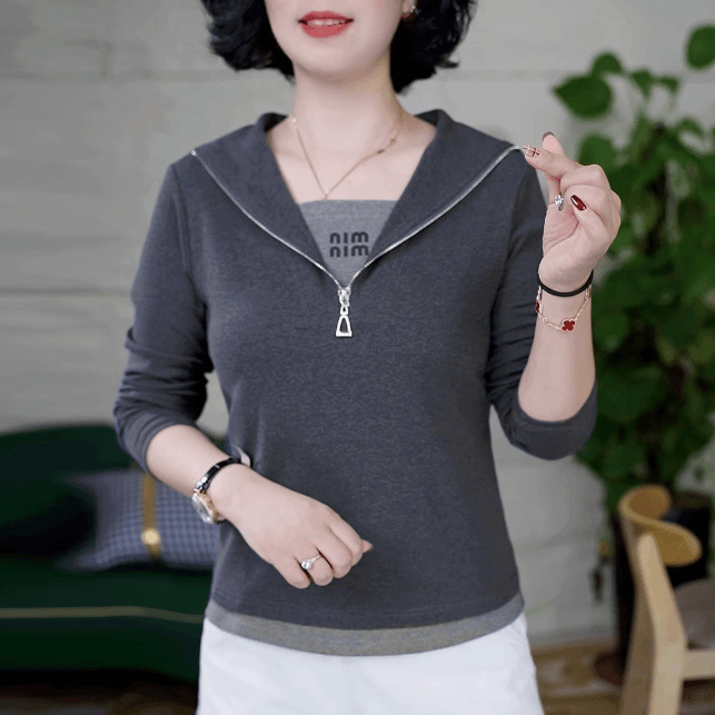 2024襟の逸品の半ファスナーの偽の2つの女性の早秋の新型の洋気の純色の百合の洋気はやせている上着を現します。